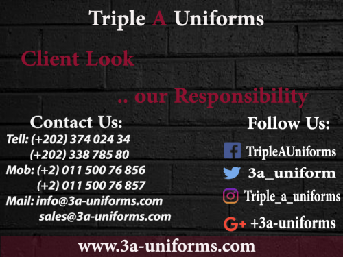 شركة تريبل ايه يونيفورم شركة مصريه متخصصة في صناعة و تصدير جميع انواع اليونيفورم لجميع المؤسسات مدارس مصانع شركات مطاعم مستشفيات في أنحاء الوطن العربي بأجود الخامات وأرقي التصميمات وبأسعار لاتقارن جميع خامات الشركة مصنعه باقطان وغزول مصريه 100% معالجه ضد الشمس والعرق والانكماش ضمان عام كامل ضد عيوب الصناعه لمزيد من المعلومات زوروا موقعنا علي www.3a-uniforms.com
