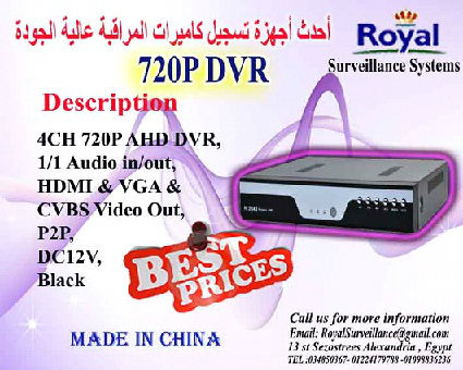 تتقدم شركة Royal Surveillance systems المتخصصة في جميع أنظمة الاتصالات و الأنظمة الأمنية ولديها خبراء متخصصون في تلك الأنظمةCommunication & Security & Control Systems عرض أحدث أجهزة تسجيل كاميرات المراقبة عالية الجودة 4CH لتأمين و حماية المحلات و الفيلات و المصانع والصيدليات والعديد من مواقع العمل الداخلية و التى يمكن متابعتها عبر شبكة الانترنت و ذلك بأسعار منافسة و تخفيضات هائلة.