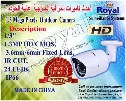 تتقدم شركة Royal Surveillance systems المتخصصة في جميع أنظمة الاتصالات و الأنظمة الأمنية ولديها خبراء متخصصون في تلك الأنظمةCommunication & Security & Control Systems عرض أحدث كاميرات مراقبة الخارجية ذات رؤية ليلية TV لتأمين و حماية المحلات و الفيلات و المصانع والصيدليات والعديد من مواقع العمل الخارجية و التى يمكن متابعتها عبر شبكة الانترنت و ذلك بأسعار منافسة و تخفيضات هائلة.