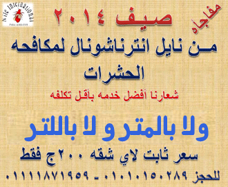 شركة نايل انترناشونال شركة متخصصة فى مكافحة الحشرات الطائرة (ذباب – ناموس – هاموش) والحشرات الزاحفة (صراصير – نمل) وحشرات الفراش (بق – براغيث) والقوارض (فئران – عرس) والطيور والحيوانات الضالة والثعابين والعقارب .