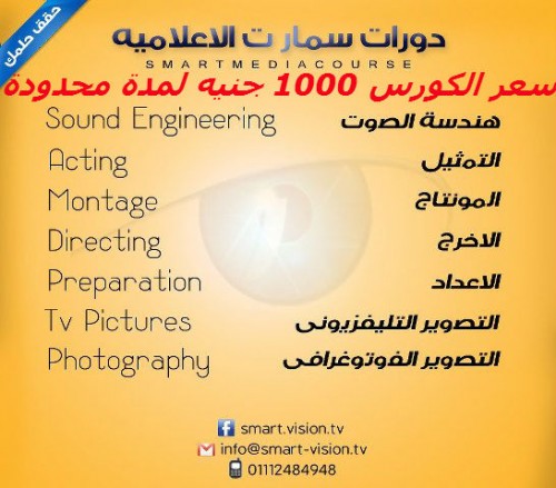 تعـلن شركة سمارت فيجن للانتاج المرئي والمسموع عن فتح باب الحجز فى منحة كورس الاخراج التلفزيوني المونتاج الهندسة الصوتية التصوير الفتوغرافي والتلفزيوني تمثيل اعداد وتقديم برسوم وقدرها1000 جنيها فقط لا غيرلكل كورس بدلا من 2500 جنيها .. وذلك لفترة محدودة .المنحه عبارة عن : 36 ساعة مقسمة على حسب الاتفاق مع المتدرب ويوجد كورسات مكثفة لغير المقيمين . الشهادة معتمدة من سمارت فيجن للانتاج المرئي والمسموع ,كما لدينا شهادات خبرة ترفق مع شهادة الدورة والدراسة عملية من اول محاضرة. العنوان : ٢٨ شارع طيبة – جامعة الدول – المهندسين – الجيزة . مصر ويوجد فرع في شارع الهرم الرئيسي