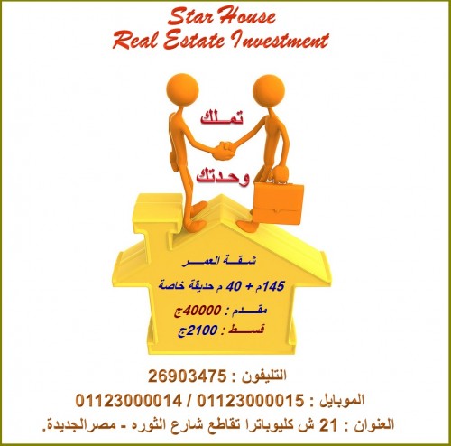 شقة 145 م بها حديقة حق انتفاع 40 م