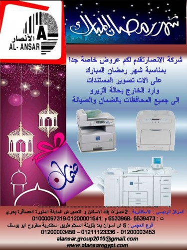شركة الانصار لالات تصوير المستندات تهنئ الامة الاسلامية وكل عملائها الكرام بشهر رمضان المبارك اعاده الله علينا وعليكم بالخيرواليمن والبركات