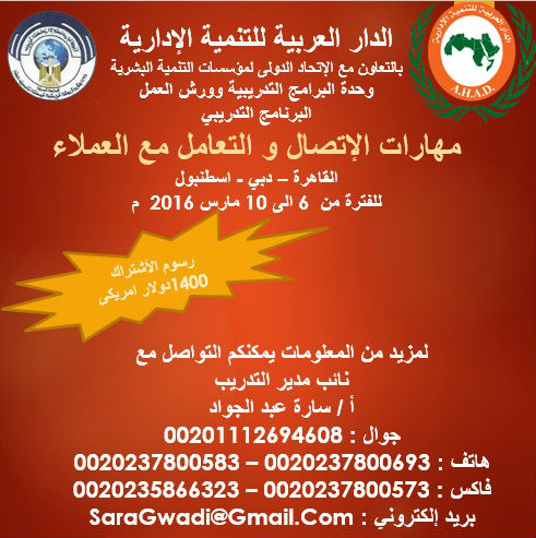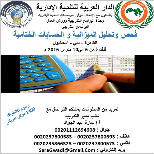 - برنامج تدريبى : إعداد وتطوير اللوائح المالية 2 _ورشة عمل : استخدام الأنظمة الآلية فى عمليات الفهرسة و التصنيف (القاهرة – جمهورية مصر العربية للفترة من 25 الى 29 يناير 2015م)
