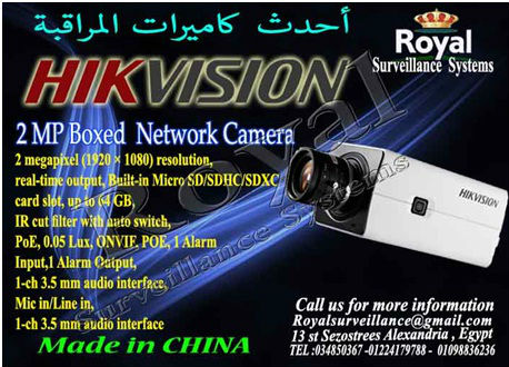 تتشرف شركة Royal Surveillance systems المتخصصة في جميع أنظمة الاتصالات و الأنظمة الأمنية ولديها خبراء متخصصون في تلك الأنظمةCommunication & Security & Control Systems بعرض كاميرات مراقبة داخلية IP ماركة HIKVISION بدرجة وضوح صورة MP 2