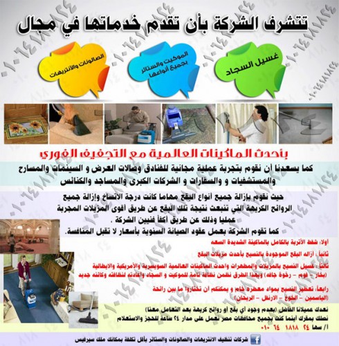 - ملك سيرفيس تنفرد بتنظيف السجاد والموكيت داخل المساجد وبتخفيضات كبيره بمناسبه العيد 01064181824