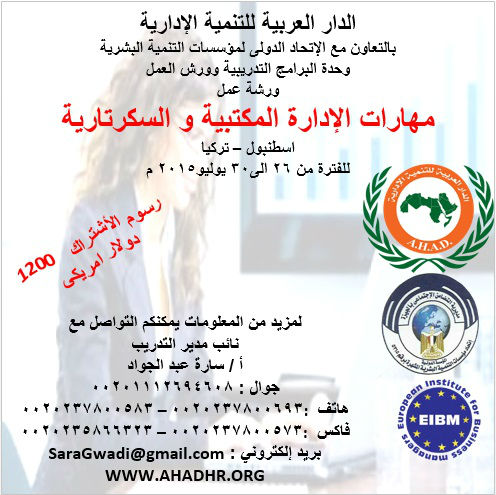 ورشة عمل : مهارات الإدارة المكتبية و السكرتاريةاسطنبول – تركيا للفترة من 26 الى 30 يوليو 2015 م